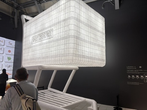 日本の食べる量を1とした各国の比較、水道水が飲める国が19カ国しかない事実、10年分の食料を巨大なショッピングカートに模した展示、未来の技術の紹介などが並んでいました。